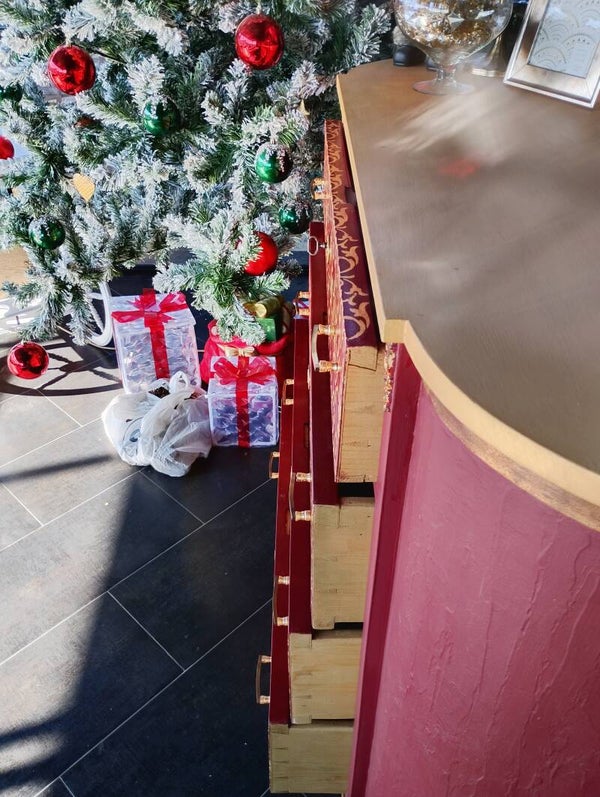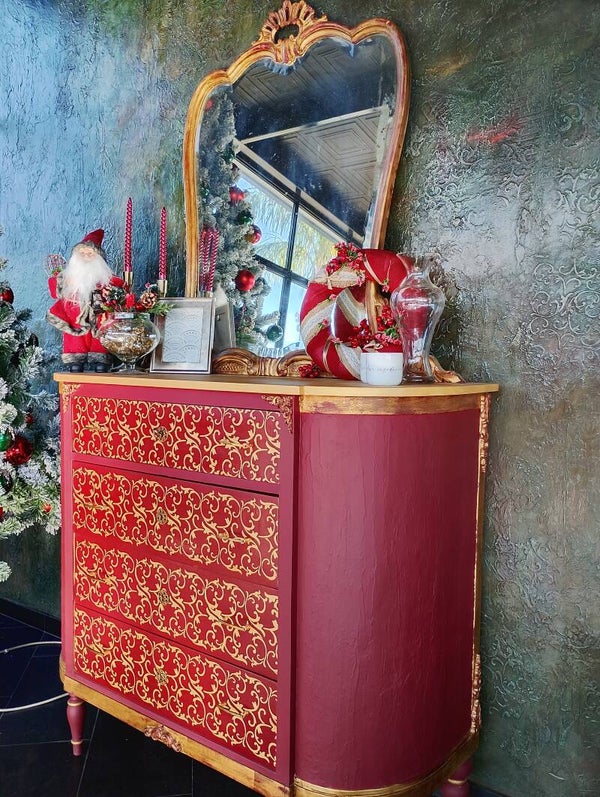 Como' con specchiera . Decori dei cassetti realizzati in foglia oro cosi' come la specchiera. Mantenute le maniglie originali. Il piano e' in marmo ridipinto color oro. Dim como : Altezza 113 cm- larghezza 134 cm- profondità 50 cm, Dimensioni cornice : altezza 110 cm- largezza 80 cm